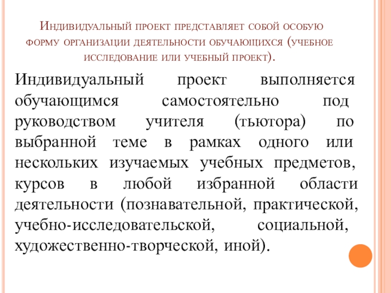 Индивидуальный проект выполняется обучающимся самостоятельно под руководством учителя (тьютора) по выбранной теме в рамках одного или нескольких изучаемых учебных предметов, курсов в любой избранной области деятельности (познавательной, практической, учебно-исследовательской, социальной, художественно-творческой, иной).