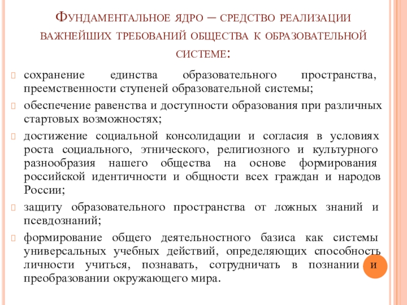 Слайд 10Фундаментальное ядро – средство реализации важнейших требований общества к образовательной системе: