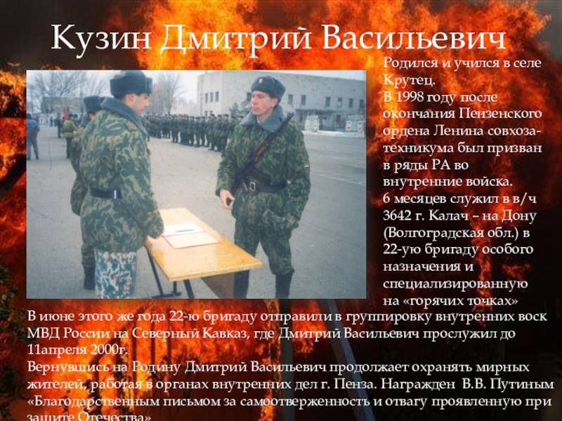 Вернувшись на Родину Дмитрий Васильевич продолжает охранять мирных жителей, работая в органах внутренних дел г. Пенза. Награжден В.В. Путиным «Благодарственным письмом за самоотверженность и отвагу проявленную при защите Отечества»