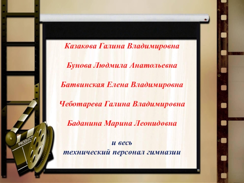 Казакова Галина ВладимировнаБунова Людмила АнатольевнаБатвинская Елена ВладимировнаЧеботарева Галина ВладимировнаБаданина Марина Леонидовнаи весь технический персонал гимназии