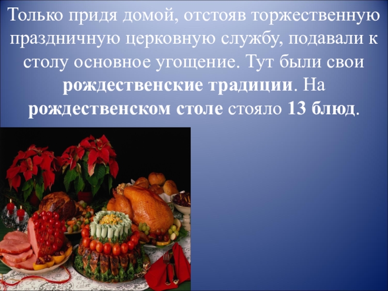 Слайд 14Только придя домой, отстояв торжественную праздничную церковную службу, подавали к столу