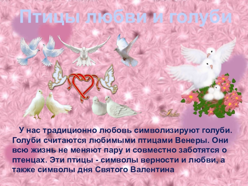 Слайд 18 У нас традиционно любовь символизируют голуби. Голуби считаются любимыми