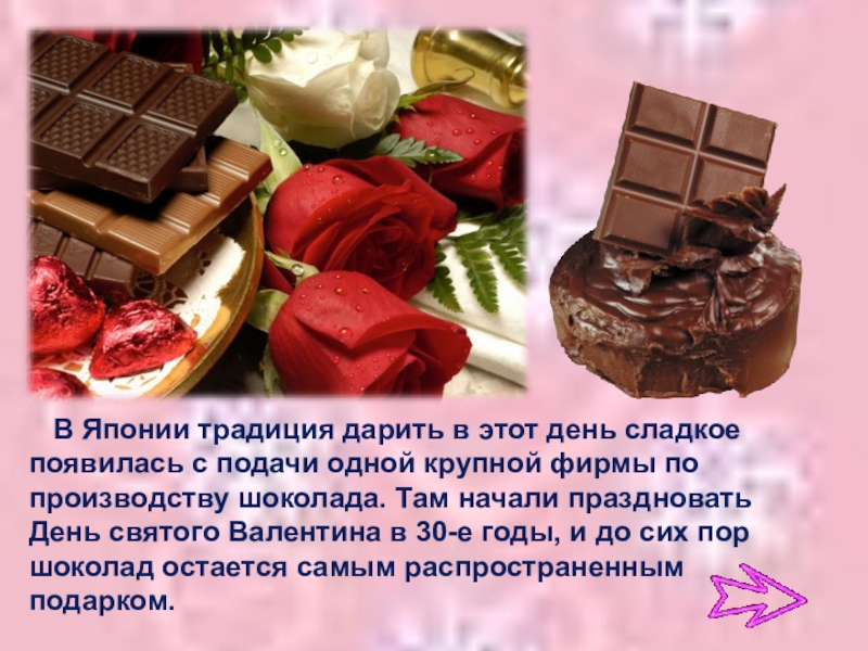 день сладкое появилась с подачи одной крупной фирмы по производству шоколада. Там начали праздновать День святого Валентина в 30-е годы, и до сих пор шоколад остается самым распространенным подарком.