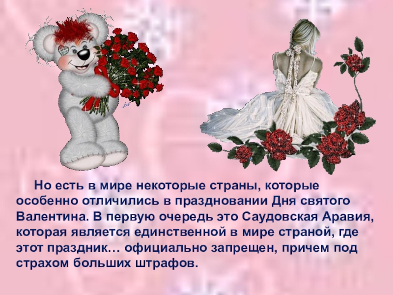 страны, которые особенно отличились в праздновании Дня святого Валентина. В первую очередь это Саудовская Аравия, которая является единственной в мире страной, где этот праздник… официально запрещен, причем под страхом больших штрафов.