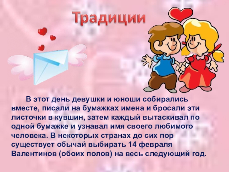 вместе, писали на бумажках имена и бросали эти листочки в кувшин, затем каждый вытаскивал по одной бумажке и узнавал имя своего любимого человека. В некоторых странах до сих пор существует обычай выбирать 14 февраля Валентинов (обоих полов) на весь следующий год.