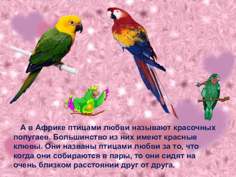 Слайд 19 А в Африке птицами любви называют красочных попугаев. Большинство