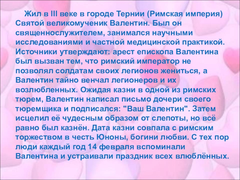 Святой великомученик Валентин. Был он священнослужителем, занимался научными исследованиями и частной медицинской практикой. Источники утверждают: арест епископа Валентина был вызван тем, что римский император не позволял солдатам своих легионов жениться, а Валентин тайно венчал легионеров и их возлюбленных. Ожидая казни в одной из римских тюрем, Валентин написал письмо дочери своего тюремщика и подписался: "Ваш Валентин". Затем исцелил её чудесным образом от слепоты, но всё равно был казнён. Дата казни совпала с римским торжеством в честь Юноны, богини любви. С тех пор люди каждый год 14 февраля вспоминали Валентина и устраивали праздник всех влюблённых.