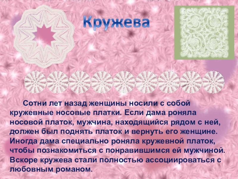 кружевные носовые платки. Если дама роняла носовой платок, мужчина, находящийся рядом с ней, должен был поднять платок и вернуть его женщине. Иногда дама специально роняла кружевной платок, чтобы познакомиться с понравившимся ей мужчиной. Вскоре кружева стали полностью ассоциироваться с любовным романом.
