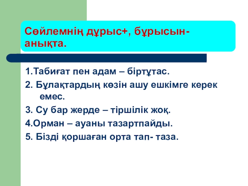 Слайд 19Сөйлемнің дұрыс+, бұрысын- анықта.