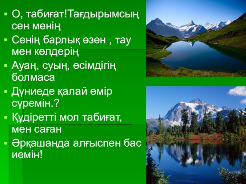 О, табиғат!Тағдырымсың сен меніңСенің барлық өзен , тау мен көлдеріңАуаң, суың, өсімдігің болмасаДүниеде қалай өмір сүремін.?Құдіретті мол