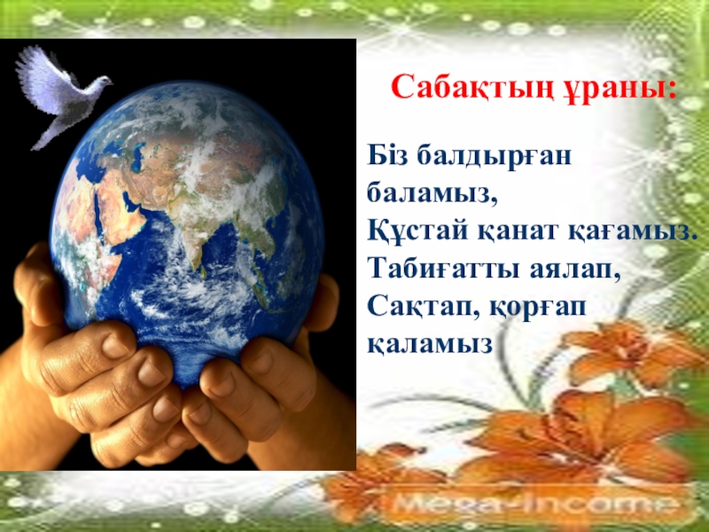 Сабақтың ұраны:Біз балдырған баламыз, Құстай қанат қағамыз. Табиғатты аялап, Сақтап, қорғап қаламыз