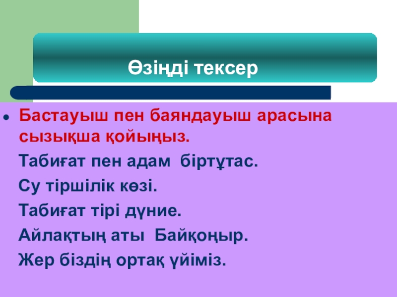 Өзіңді тексерБастауыш пен баяндауыш арасына сызықша қойыңыз.  Табиғат