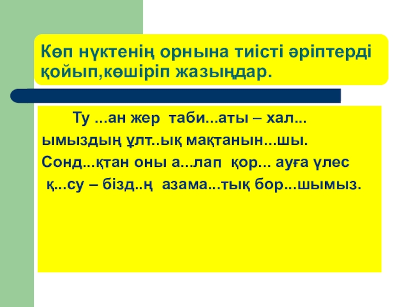Слайд 20Көп нүктенің орнына тиісті әріптерді қойып,көшіріп жазыңдар.