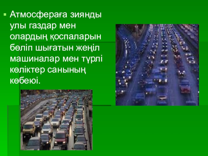Атмосфераға зиянды улы газдар мен олардың қоспаларын бөліп шығатын жеңіл машиналар мен түрлі көліктер санының көбеюі.