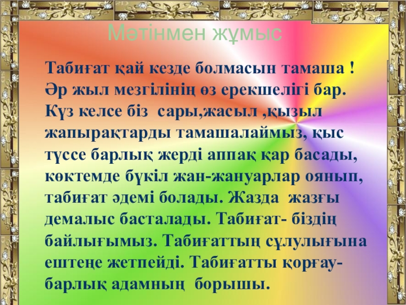 Мәтінмен жұмыс Табиғат қай кезде болмасын тамаша ! Әр жыл мезгілінің өз ерекшелігі бар. Күз келсе біз