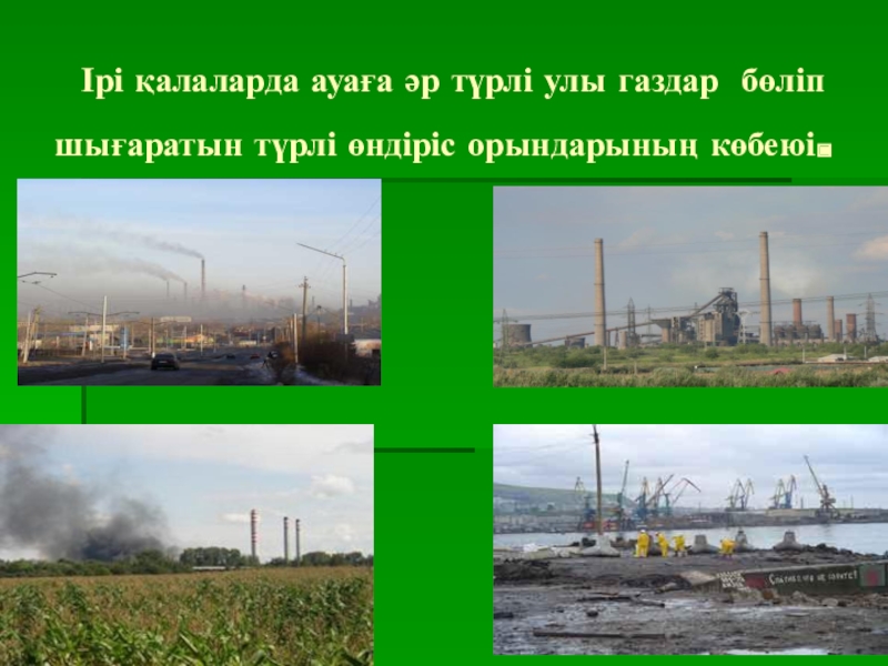 Слайд 12 Ірі қалаларда ауаға әр түрлі улы газдар бөліп шығаратын түрлі