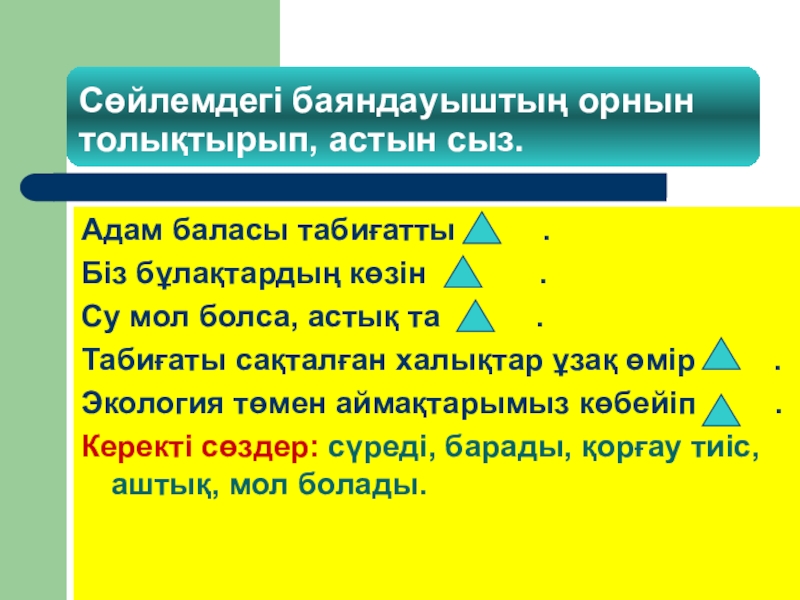 Слайд 18Сөйлемдегі баяндауыштың орнын толықтырып, астын сыз.