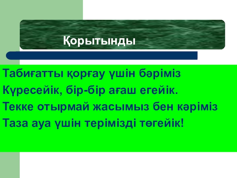 Қорытынды Табиғатты қорғау үшін бәрімізКүресейік, бір-бір ағаш егейік.Текке отырмай жасымыз бен