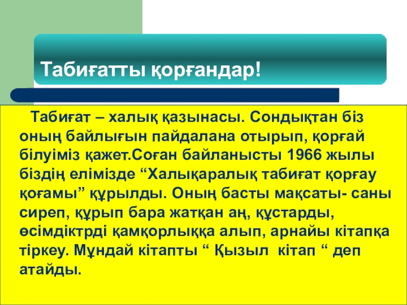 байлығын пайдалана отырып, қорғай білуіміз қажет.Соған байланысты 1966 жылы біздің елімізде “Халықаралық табиғат қорғау қоғамы” құрылды. Оның басты мақсаты- саны сиреп, құрып бара жатқан аң, құстарды, өсімдіктрді қамқорлыққа алып, арнайы кітапқа тіркеу. Мұндай кітапты “ Қызыл кітап “ деп атайды.