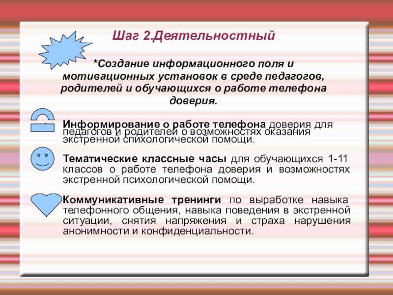 Коммуникативные тренинги по выработке навыка телефонного общения, навыка поведения в экстренной ситуации, снятия напряжения и страха нарушения анонимности и конфиденциальности.