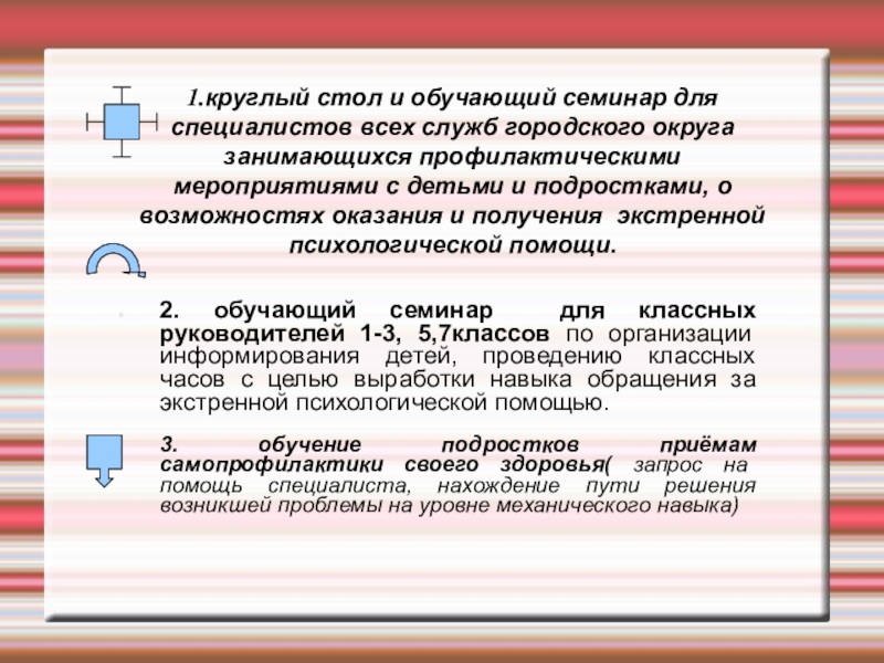 2. обучающий семинар для классных руководителей 1-3, 5,7классов по организации информирования детей, проведению классных часов с целью выработки навыка обращения за экстренной психологической помощью.