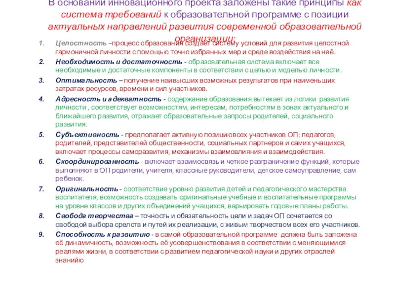 Оригинальность - соответствие уровню развития детей и педагогического мастерства воспитателя, возможность создавать оригинальные учебные и воспитательные программы на уровне классов и других объединений учащихся, варьировать годовые планы работы.
