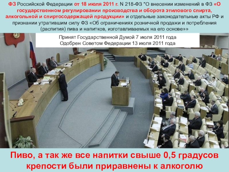 ФЗ Российской Федерации от 18 июля 2011 г. N 218-ФЗ "О внесении изменений в ФЗ «О государственном регулировании производства и оборота этилового спирта, алкогольной и спиртосодержащей продукции» и отдельные законодательные акты РФ и признании утратившим силу ФЗ «Об ограничениях розничной продажи и потребления (распития) пива и напитков, изготавливаемых на его основе»»