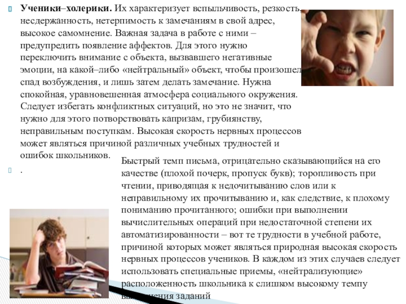 Быстрый темп письма, отрицательно сказывающийся на его качестве (плохой почерк, пропуск букв); торопливость при чтении, приводящая к недочитыванию слов или к неправильному их прочитыванию и, как следствие, к плохому пониманию прочитанного; ошибки при выполнении вычислительных операций при недостаточной степени их автоматизированности – вот те трудности в учебной работе, причиной которых может являться природная высокая скорость нервных процессов учеников. В каждом из этих случаев следует использовать специальные приемы, «нейтрализующие» расположенность школьника к слишком высокому темпу выполнения заданий