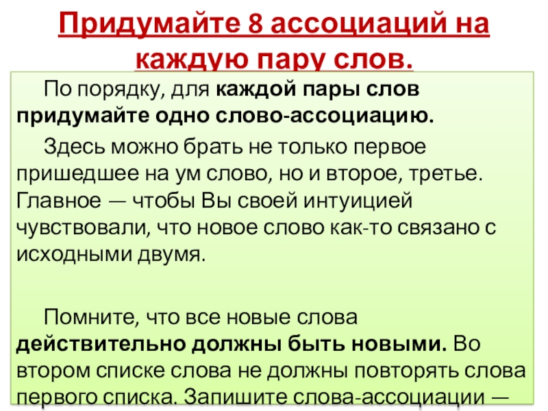 Помните, что все новые слова действительно должны быть новыми. Во втором списке слова не должны повторять слова первого списка. Запишите слова-ассоциации — их должно получиться восемь.