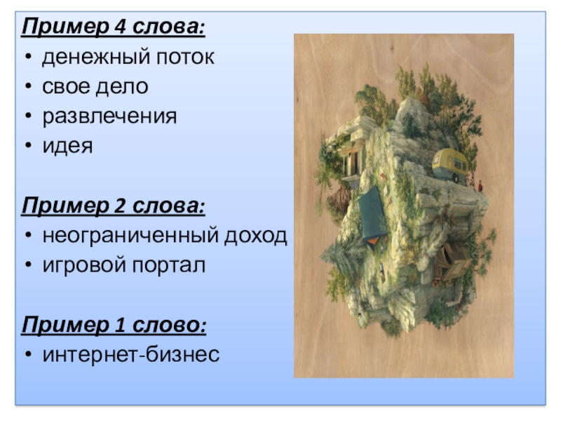 Здесь можно брать не только первое пришедшее на ум слово, но и второе, третье. Главное — чтобы Вы своей интуицией чувствовали, что новое слово как-то связано с исходными двумя.