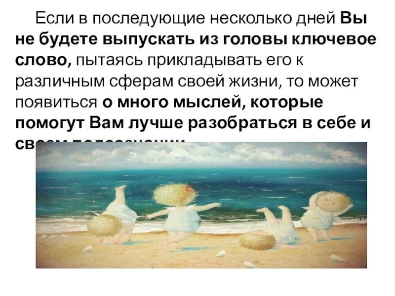 ключевое слово, пытаясь прикладывать его к различным сферам своей жизни, то может появиться о много мыслей, которые помогут Вам лучше разобраться в себе и своем подсознании.
