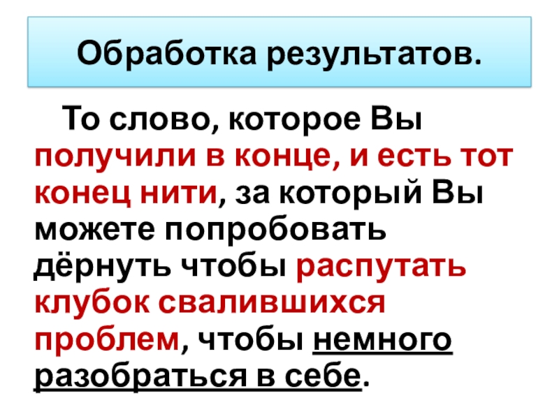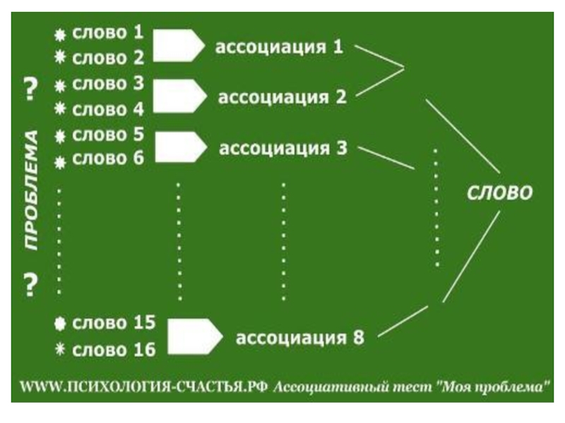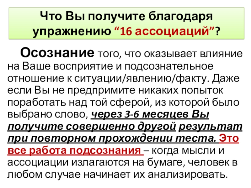 на Ваше восприятие и подсознательное отношение к ситуации/явлению/факту. Даже если Вы не предпримите никаких попыток поработать над той сферой, из которой было выбрано слово, через 3-6 месяцев Вы получите совершенно другой результат при повторном прохождении теста. Это все работа подсознания – когда мысли и ассоциации излагаются на бумаге, человек в любом случае начинает их анализировать.