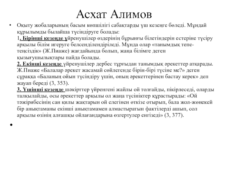 2. Екінші кезеңде үйренушілер дербес тұрғыдан танымдық әрекеттер атқарады. Ж.Пиаже «Балалар әрекет жасамай сөйлегенде бірін-бірі түсіне ме?» деген сұраққа «Баланың ойын түсіндіру үшін, оның әрекеттерінен бастау керек» деп жауап береді (3, 353).