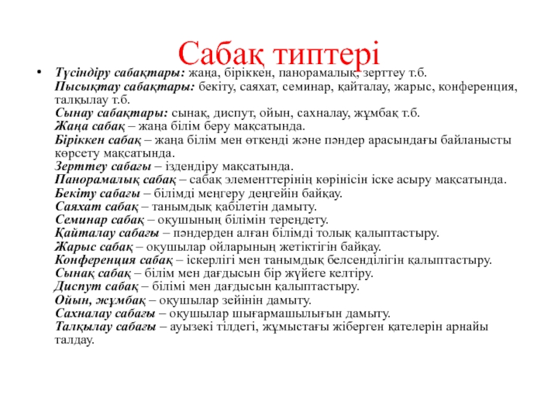Түсіндіру сабақтары: жаңа, біріккен, панорамалық, зерттеу т.б.