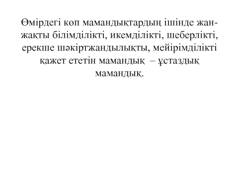 Слайд 9Өмірдегі көп мамандықтардың ішінде жан-жақты білімділікті, икемділікті, шеберлікті, ерекше шәкіртжандылықты, мейірімділікті