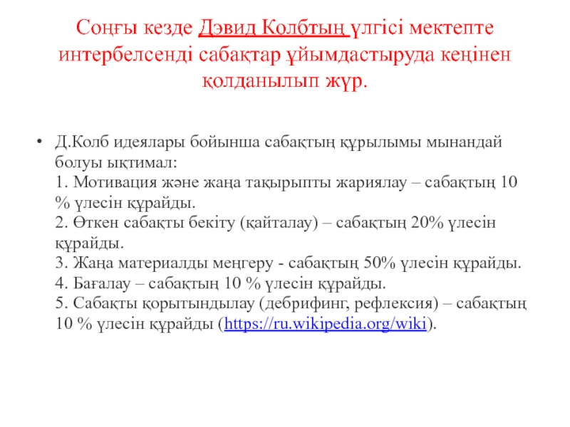 Слайд 28Соңғы кезде Дэвид Колбтың үлгісі мектепте интербелсенді сабақтар ұйымдастыруда кеңінен қолданылып
