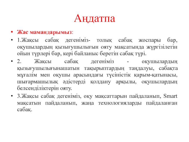 2. Жақсы сабақ дегеніміз - оқушылардың қызығушылығынашатын тақырыптардың таңдалуы, сабақта мұғалім мен оқушы арасындағы түсіністік қарым-қатынасы, шығармашылық әдістерді қолдану арқылы, оқушылардың белсенділіктерін ояту.
