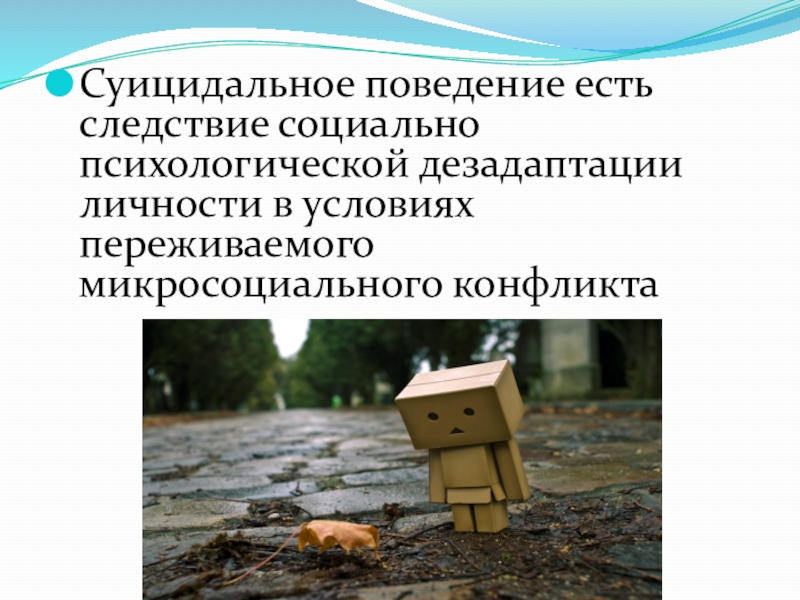 Слайд 4Суицидальное поведение есть следствие социально психологической дезадаптации личности в условиях переживаемого