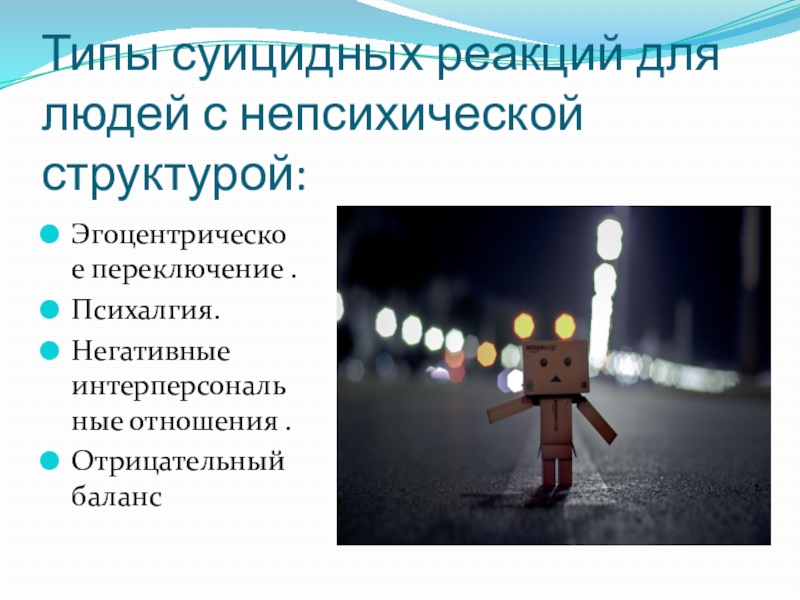 Слайд 7 Типы суицидных реакций для людей с непсихической структурой: