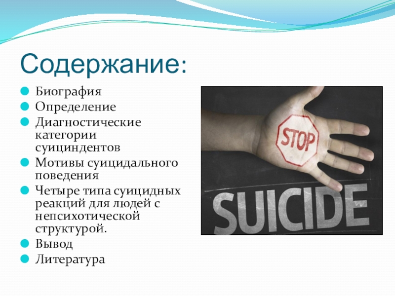 Содержание:БиографияОпределениеДиагностические категории суициндентовМотивы суицидального поведенияЧетыре типа суицидных реакций для людей с непсихотической структурой.ВыводЛитература