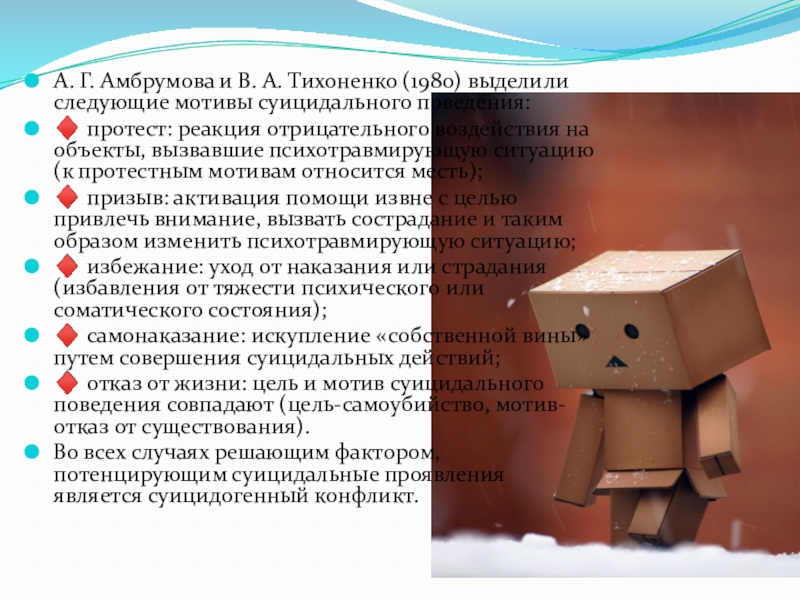 Презентация на тему : «Типология суицидов (Амбрумова А.Г.)»Подготовила:Лобанова Анастасия