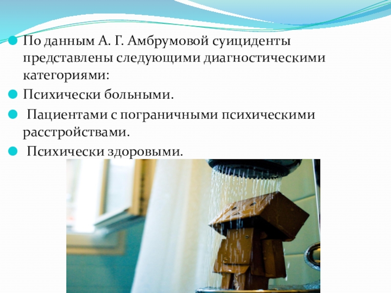 По данным А. Г. Амбрумовой суициденты представлены следующими диагностическими категориями: Психически больными. Пациентами с пограничными психическими расстройствами.