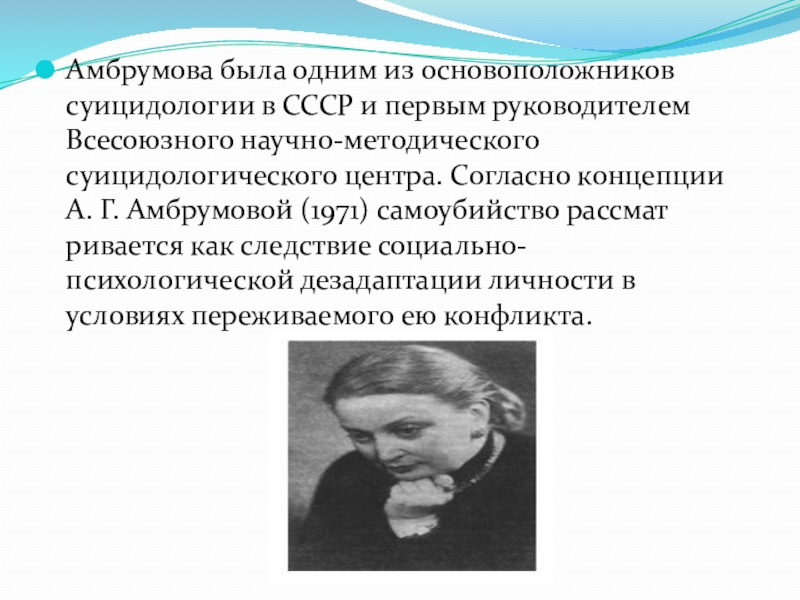 Слайд 3Амбрумова была одним из основоположников суици­дологии в СССР и первым руководителем