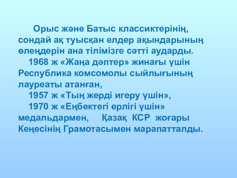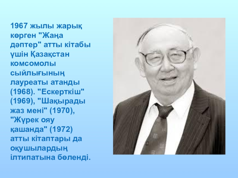 Слайд 101967 жылы жарық көрген "Жаңа дәптер" атты кітабы үшін Қазақстан комсомолы