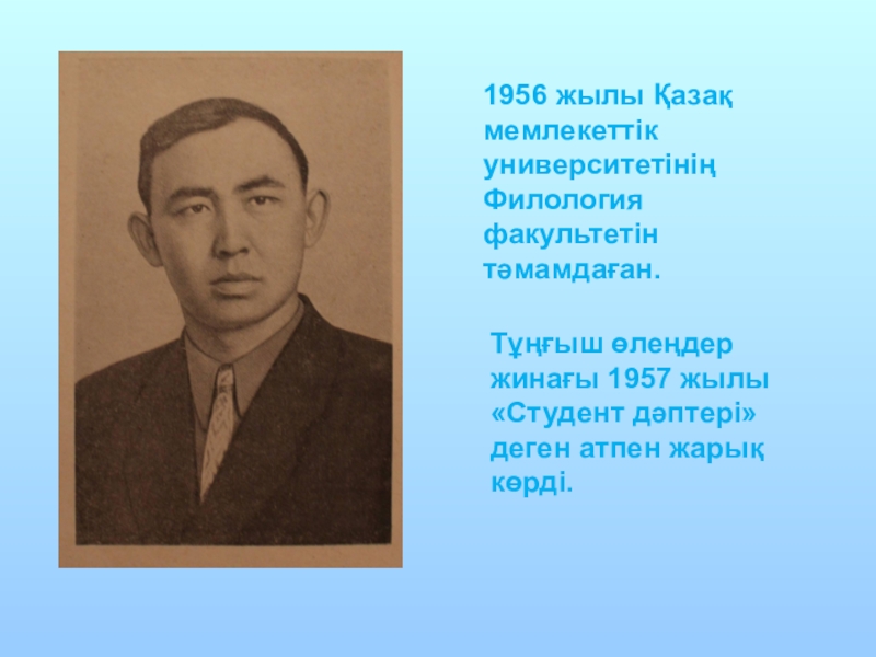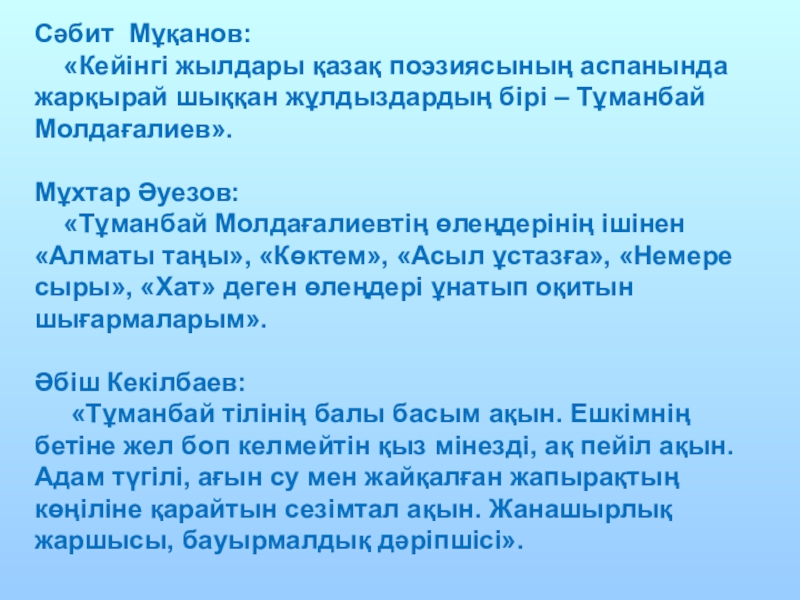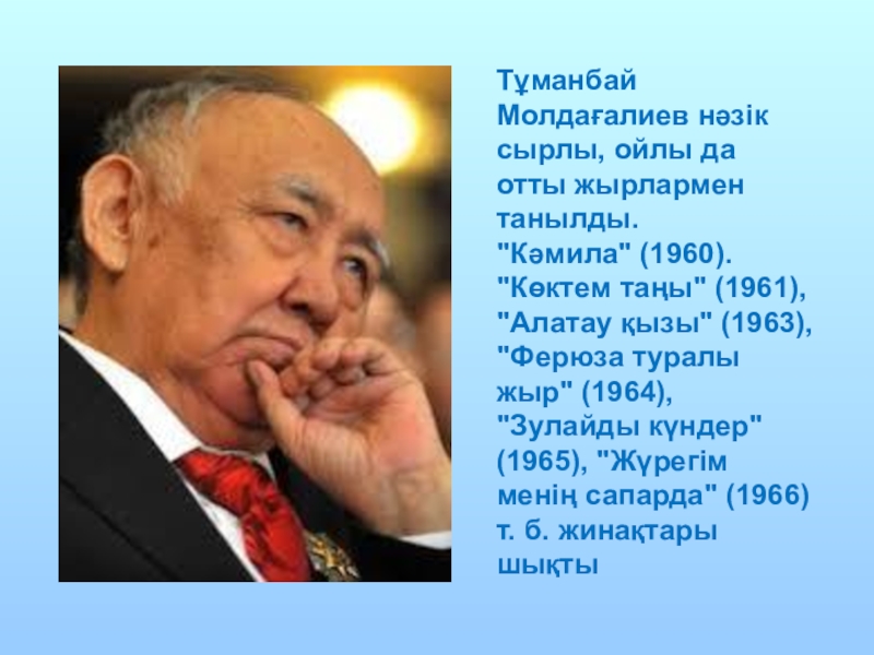 Слайд 9Тұманбай Молдағалиев нәзік сырлы, ойлы да отты жырлармен танылды.