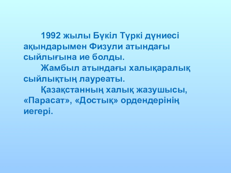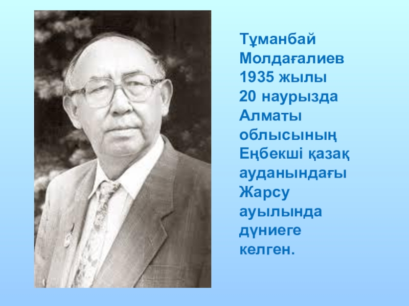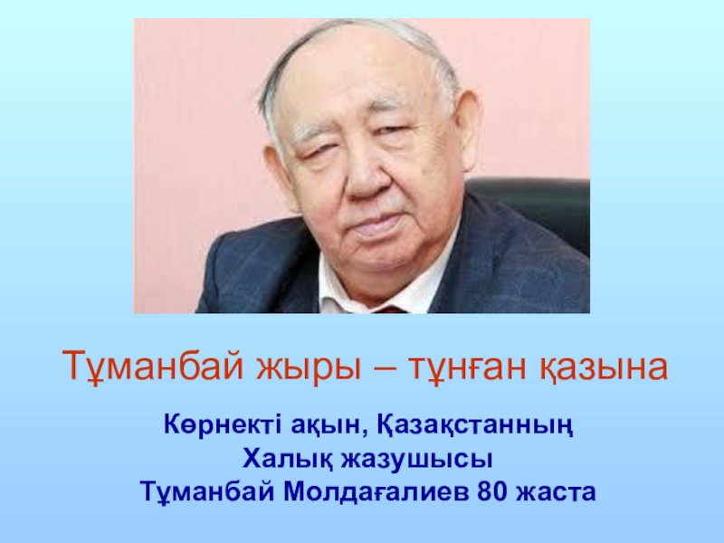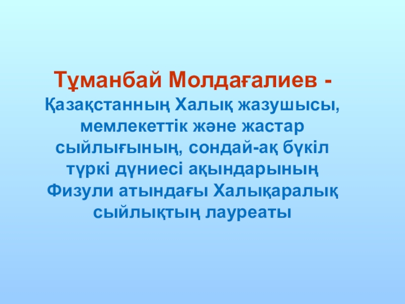 Слайд 3Тұманбай Молдағалиев - Қазақстанның Халық жазушысы, мемлекеттік және жастар сыйлығының, сондай-ақ