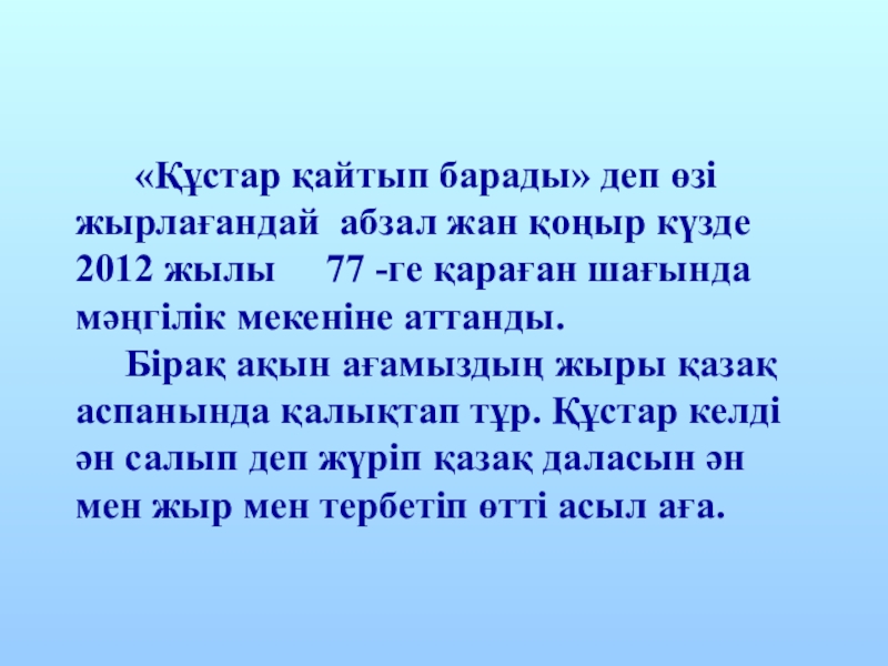 Слайд 17 «Құстар қайтып барады» деп өзі жырлағандай абзал жан