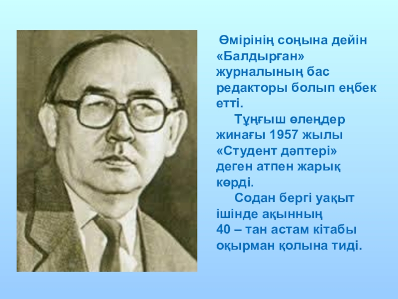Слайд 8 Өмірінің соңына дейін «Балдырған» журналының бас редакторы болып еңбек етті.
