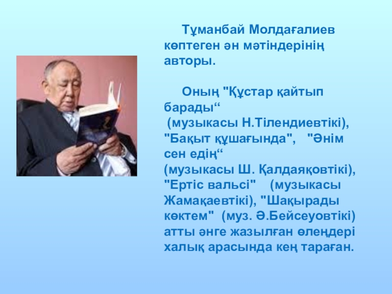 Слайд 13 Тұманбай Молдағалиев көптеген ән мәтіндерінің авторы.
