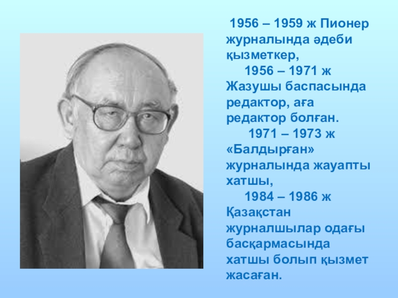Слайд 7 1956 – 1959 ж Пионер журналында әдеби қызметкер,